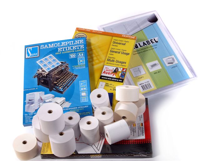 Drobni pisarniški material: mape, registratorji, pregradni kartoni, kuverte, razni obrazci, etikete, računski trakovi (LEITZ, ESSELTE, KLIPKO, STIMY ...)